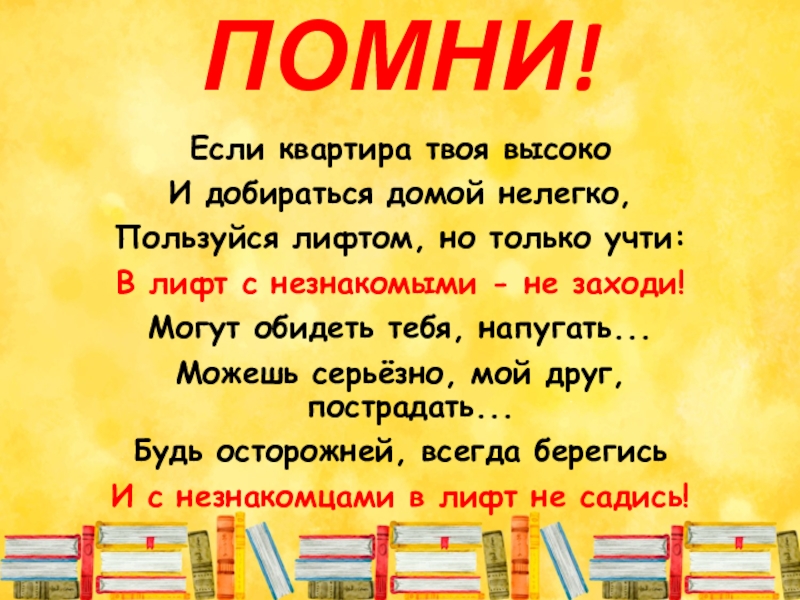 ПОМНИ!Если квартира твоя высоко И добираться домой нелегко, Пользуйся лифтом, но только учти: В лифт с незнакомыми