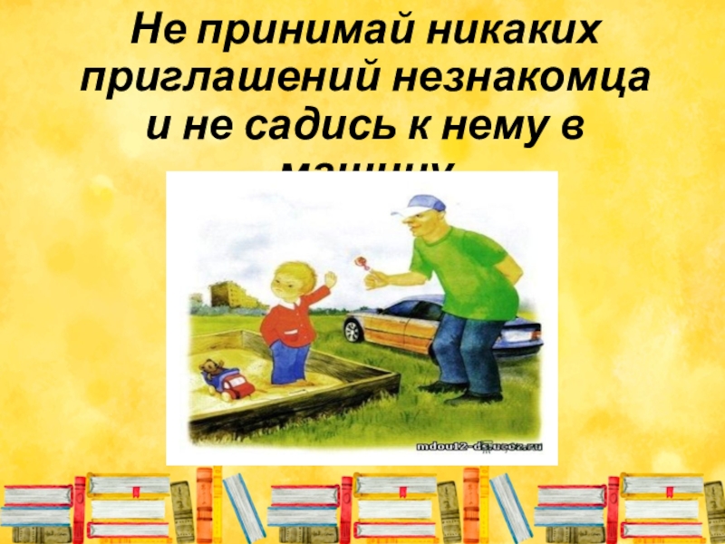 Слайд 11Не принимай никаких приглашений незнакомца и не садись к нему в
