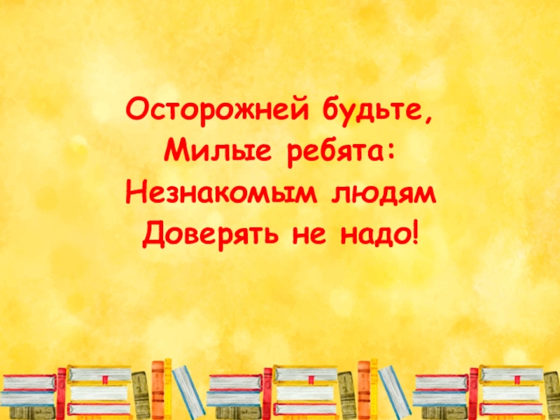 Осторожней будьте,Милые ребята:Незнакомым людямДоверять не надо!