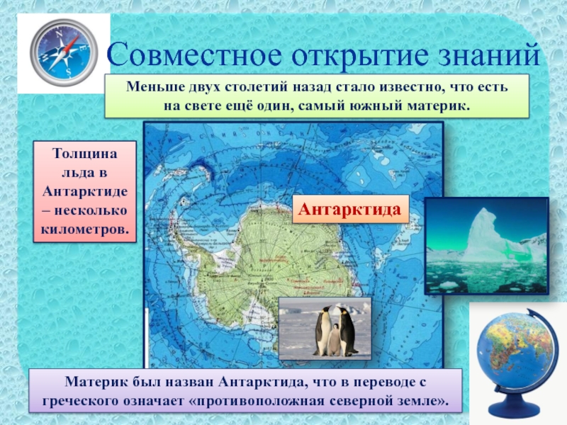 Материк был назван Антарктида, что в переводе с греческого означает «противоположная северной земле».