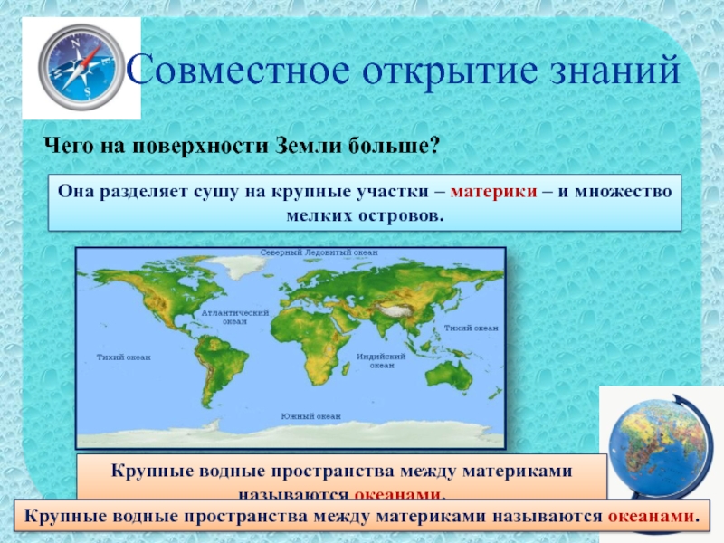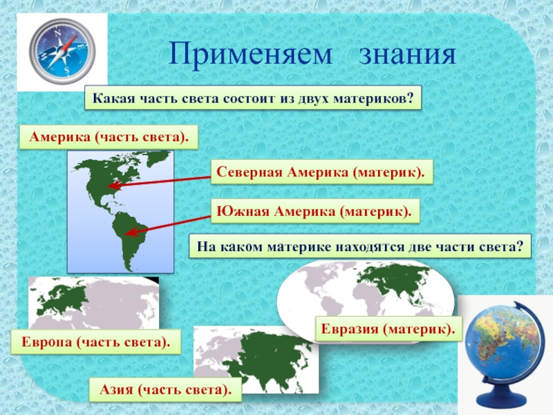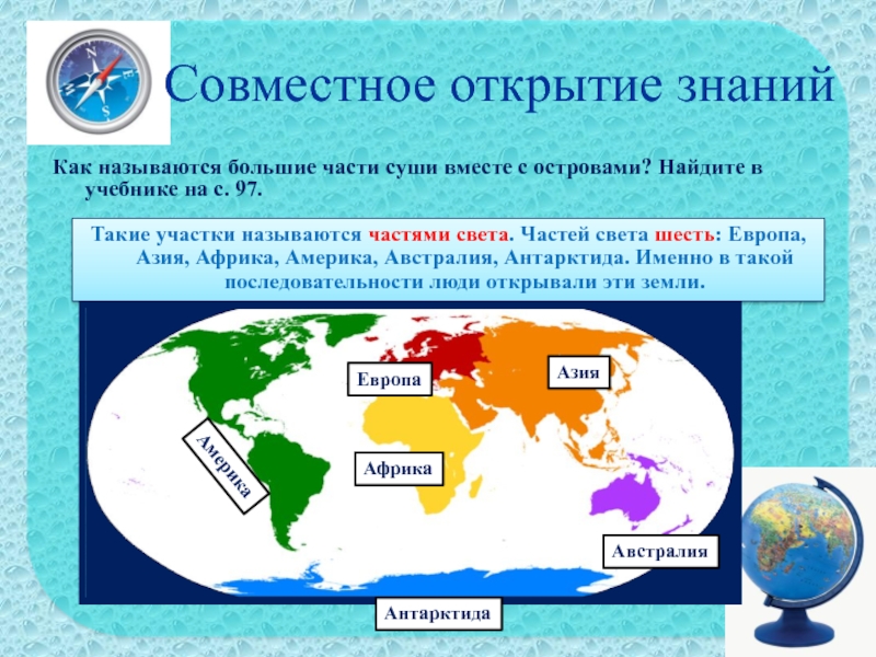 Такие участки называются частями света. Частей света шесть: Европа, Азия, Африка, Америка, Австралия, Антарктида. Именно в такой последовательности люди открывали эти земли.
