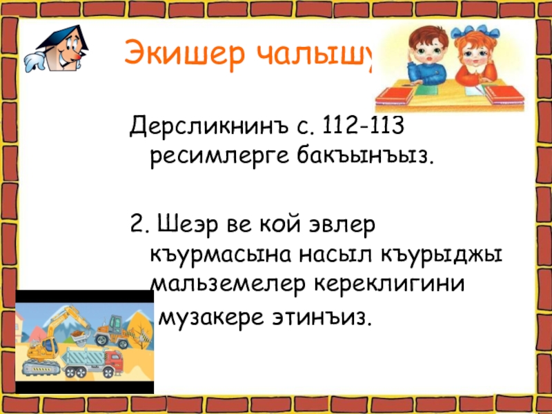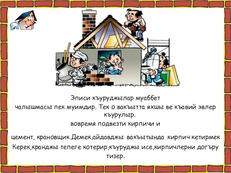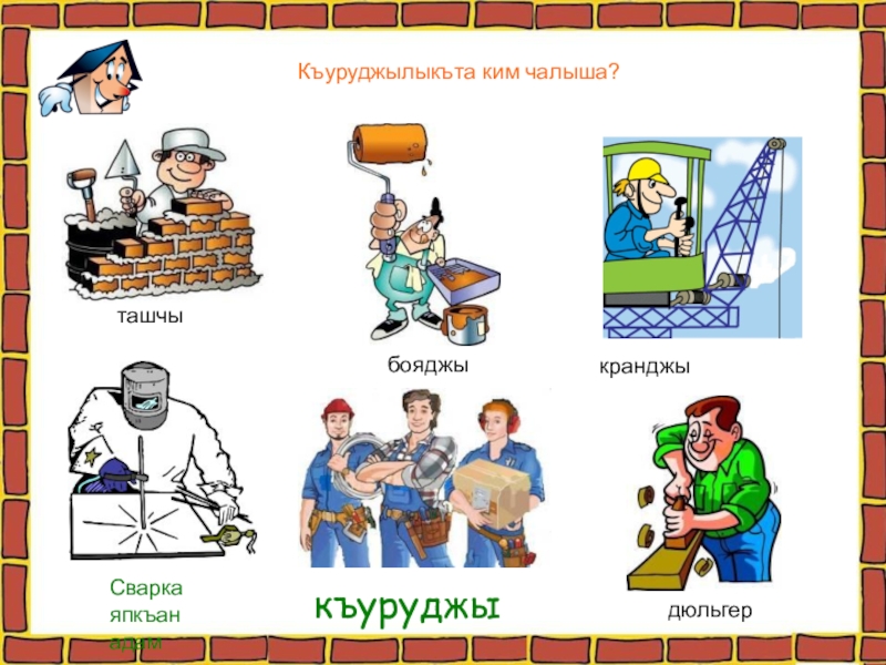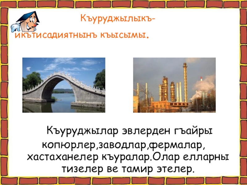 копюрлер,заводлар,фермалар,хастаханелер къуралар.Олар елларны тизелер ве тамир этелер.
