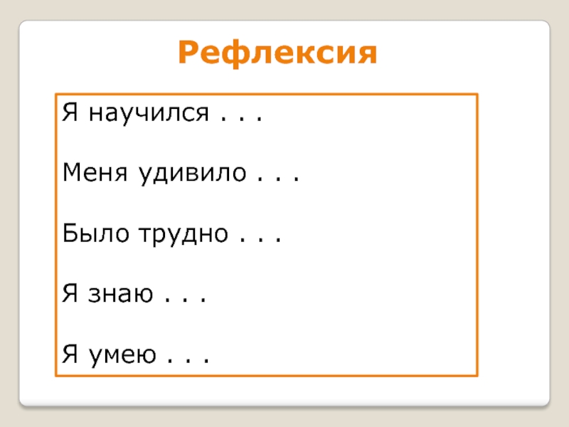 РефлексияЯ научился . . .Меня удивило . . .Было трудно . . .Я знаю . . .Я