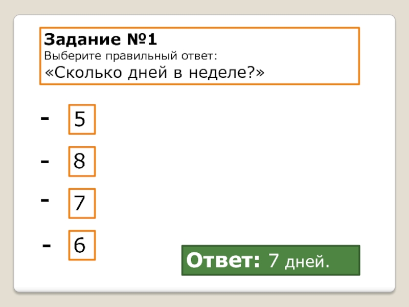 Задание №1 Выберите правильный ответ:«Сколько дней в неделе?»5876----Ответ: 7 дней.