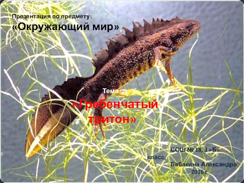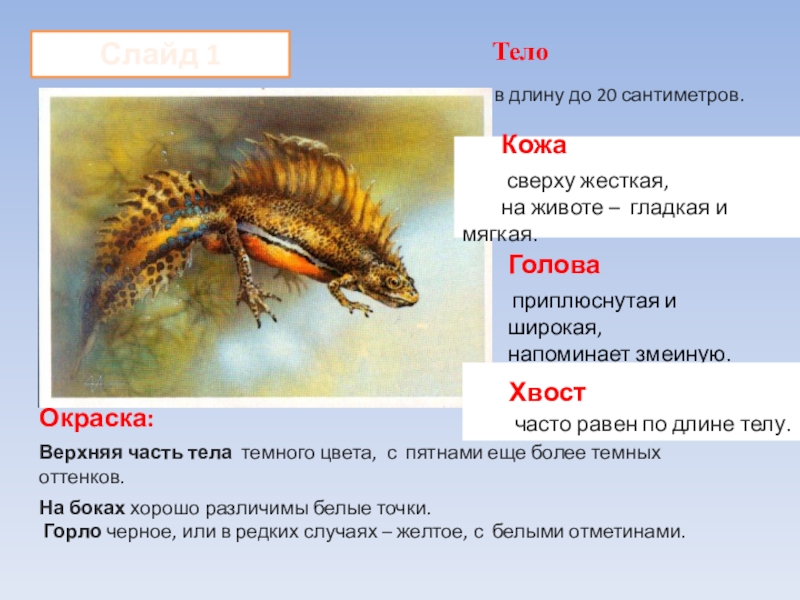 Отличие гребенчатого тритона от обыкновенного - отсутствие чёрной продольной полосы через глаз, и прерывистый у основания хвоста спинной гребень.