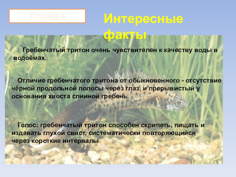 Голос: гребенчатый тритон способен скрипеть, пищать и издавать глухой свист, систематически повторяющийся через короткие интервалы