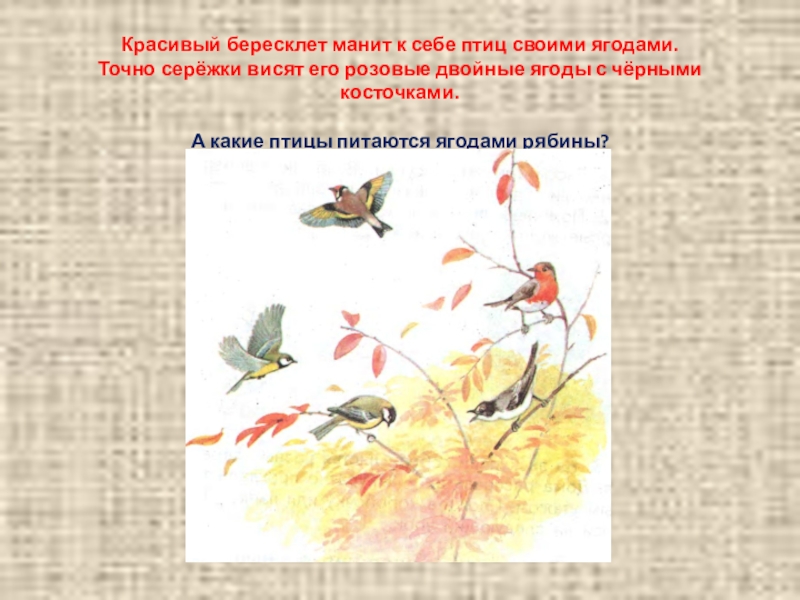 Слайд 6Красивый бересклет манит к себе птиц своими ягодами. Точно серёжки висят его