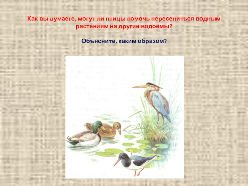 Слайд 5Как вы думаете, могут ли птицы помочь переселиться водным растениям на
