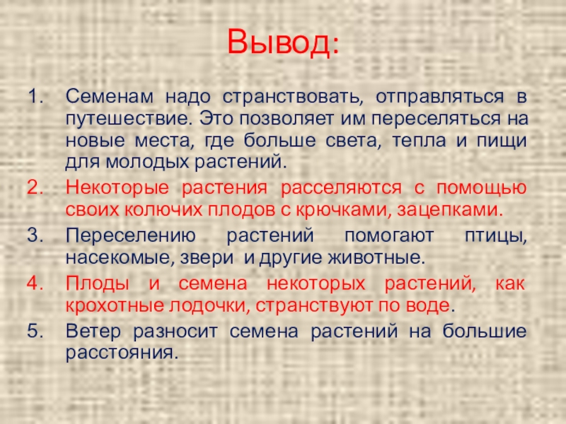 Вывод: Семенам надо странствовать, отправляться в путешествие. Это позволяет им переселяться на новые места, где больше света,