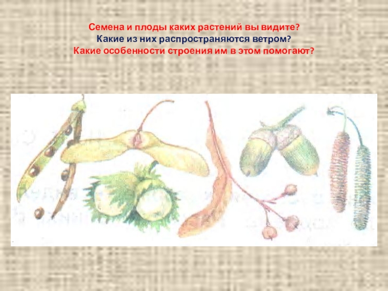 Слайд 3Семена и плоды каких растений вы видите? Какие из них распространяются ветром? Какие