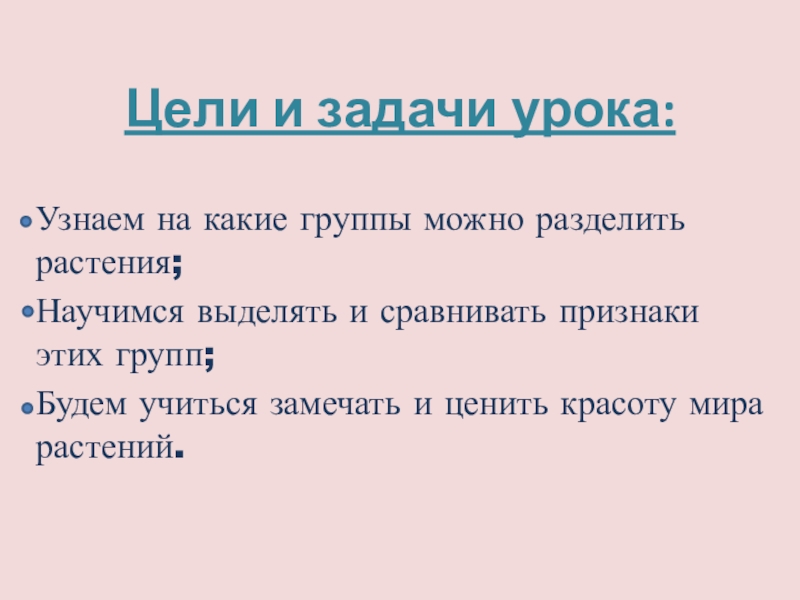 Цели и задачи урока:Узнаем на какие группы можно разделить растения;Научимся выделять и сравнивать признаки этих групп;Будем учиться замечать и ценить красоту мира растений.