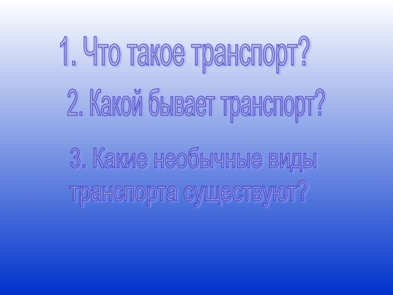 1. Что такое транспорт?2. Какой бывает транспорт?3. Какие необычные виды  транспорта существуют?