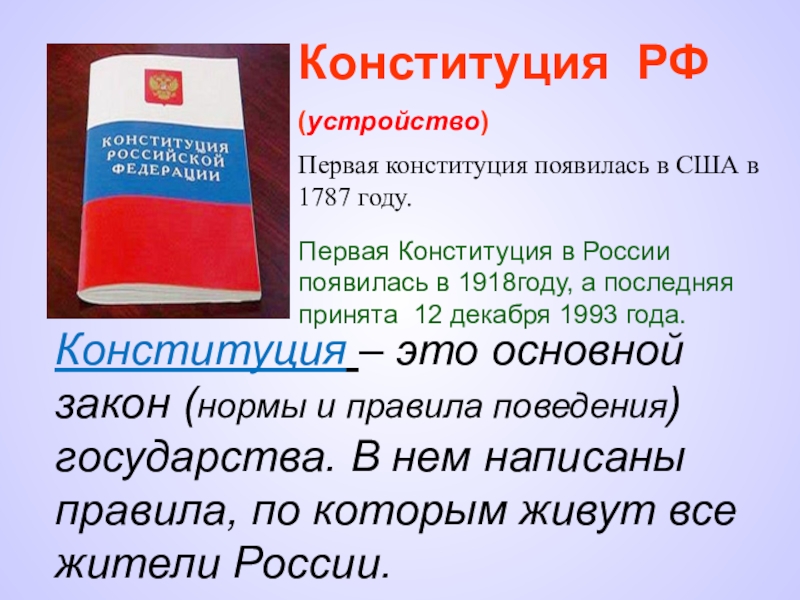 Первая Конституция в России появилась в 1918году, а последняя принята 12 декабря 1993 года.