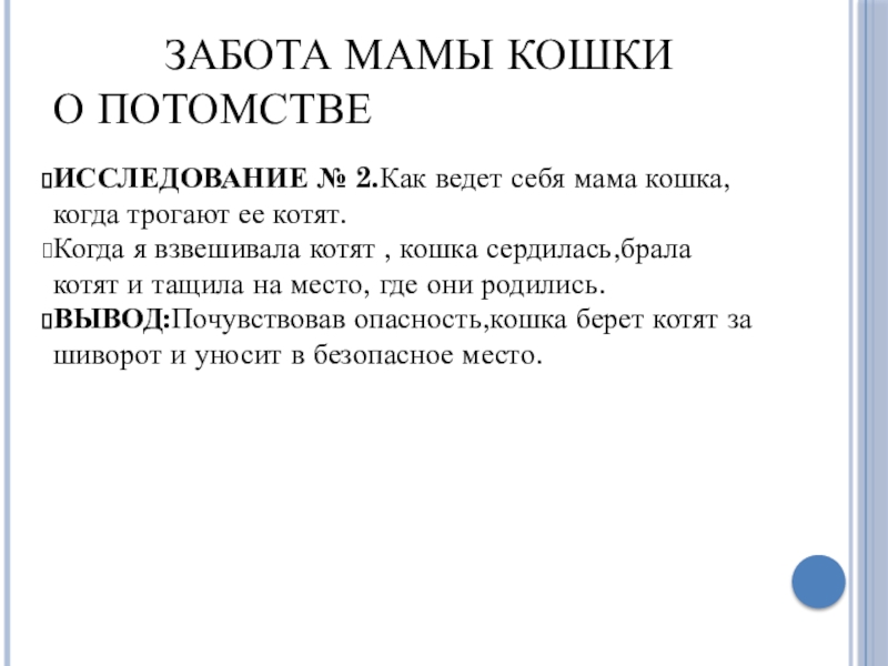 ИССЛЕДОВАНИЕ № 2.Как ведет себя мама кошка,когда трогают ее котят.