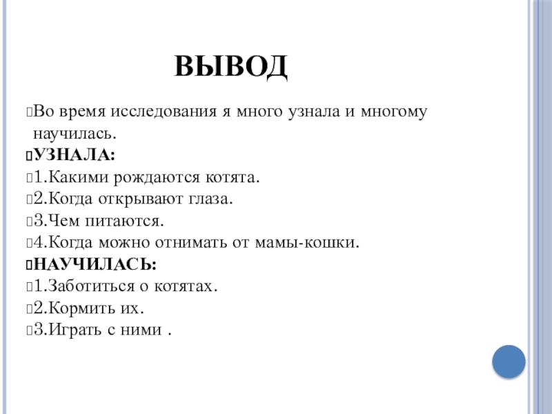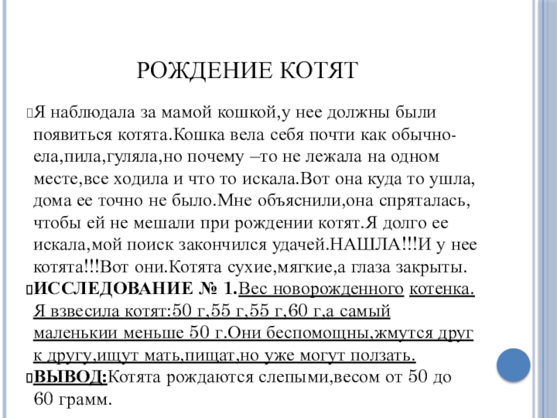ВЫВОД:Котята рождаются слепыми,весом от 50 до 60 грамм.