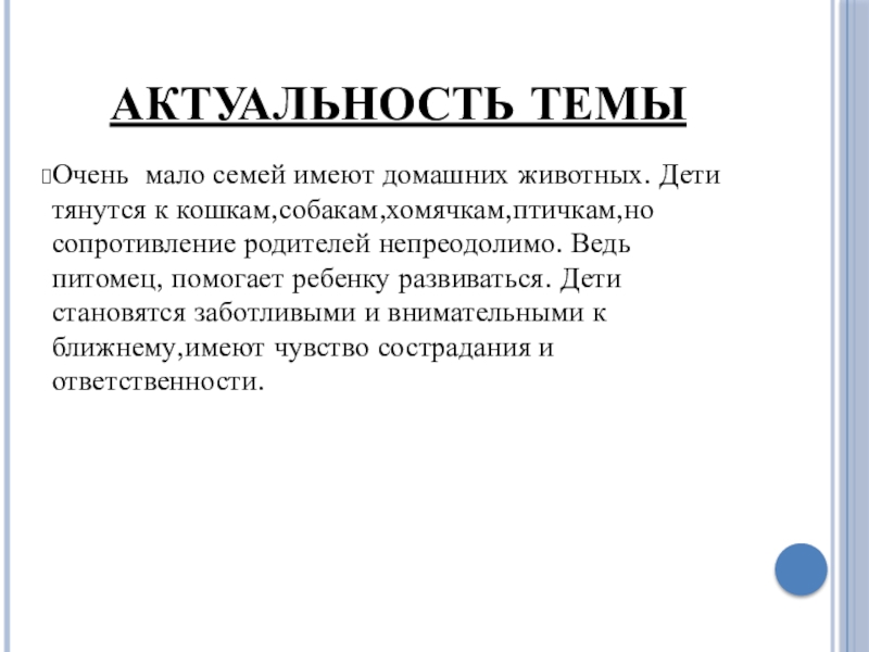 Очень мало семей имеют домашних животных. Дети тянутся к кошкам,собакам,хомячкам,птичкам,но
