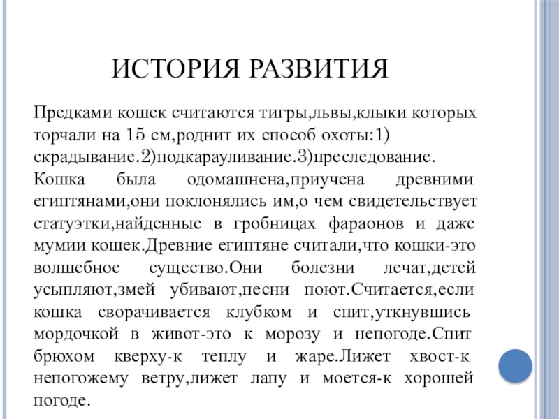 Кошка была одомашнена,приучена древними египтянами,они поклонялись им,о чем свидетельствует статуэтки,найденные в гробницах фараонов и даже мумии кошек.Древние египтяне считали,что кошки-это волшебное существо.Они болезни лечат,детей усыпляют,змей убивают,песни поют.Считается,если кошка сворачивается клубком и спит,уткнувшись мордочкой в живот-это к морозу и непогоде.Спит брюхом кверху-к теплу и жаре.Лижет хвост-к непогожему ветру,лижет лапу и моется-к хорошей погоде.
