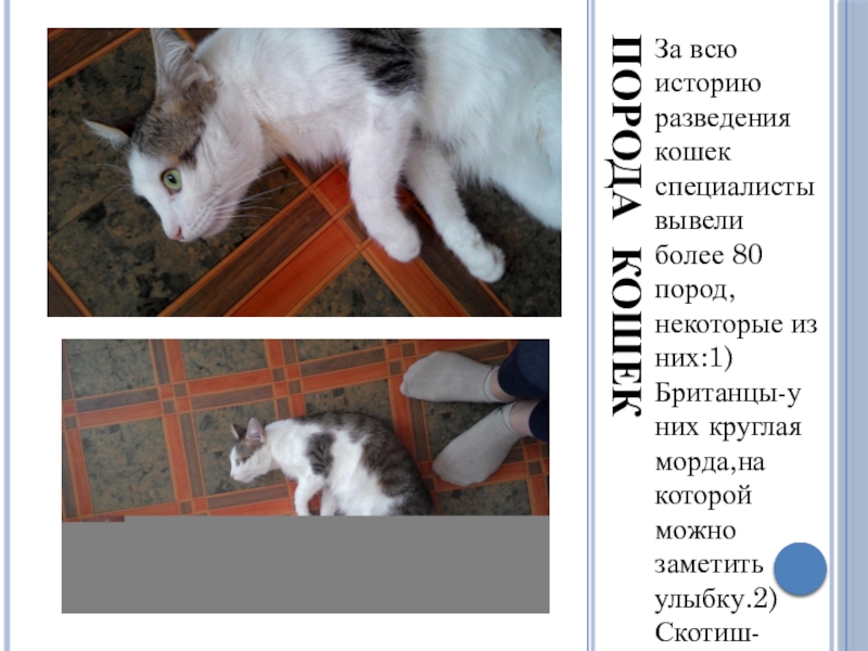 из них:1)Британцы-у них круглая морда,на которой можно заметить улыбку.2)Скотиш-фолд-вислоухие кошки с плюшевой шерстью..3) Персы –кошки отличаются удивительно обаятельной внешностью.