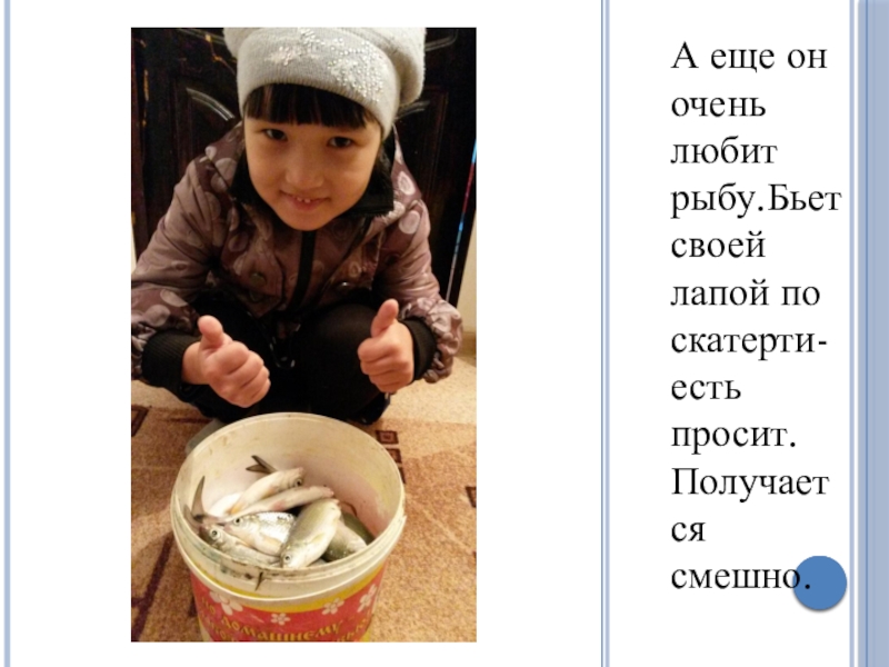 Слайд 23А еще он очень любит рыбу.Бьет своей лапой по скатерти-есть просит.Получается