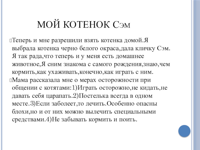взять котенка домой.Я выбрала котенка черно белого окраса,дала кличку Сэм.Я так рада,что теперь и у меня есть домашнее животное,Я сним знакома с самого рождения,знаю,чем кормить,как ухаживать,конечно,как играть с ним.