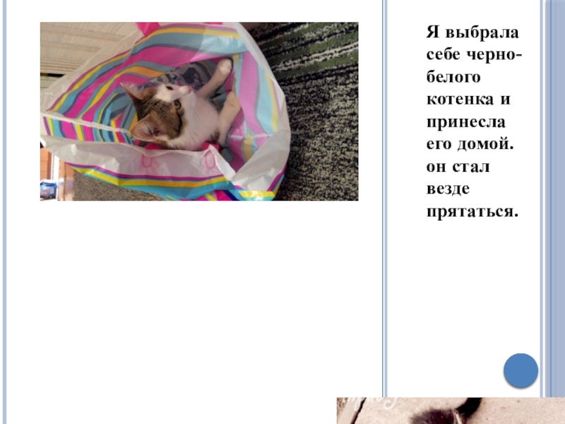 Слайд 20Я выбрала себе черно-белого котенка и принесла его домой.он стал везде