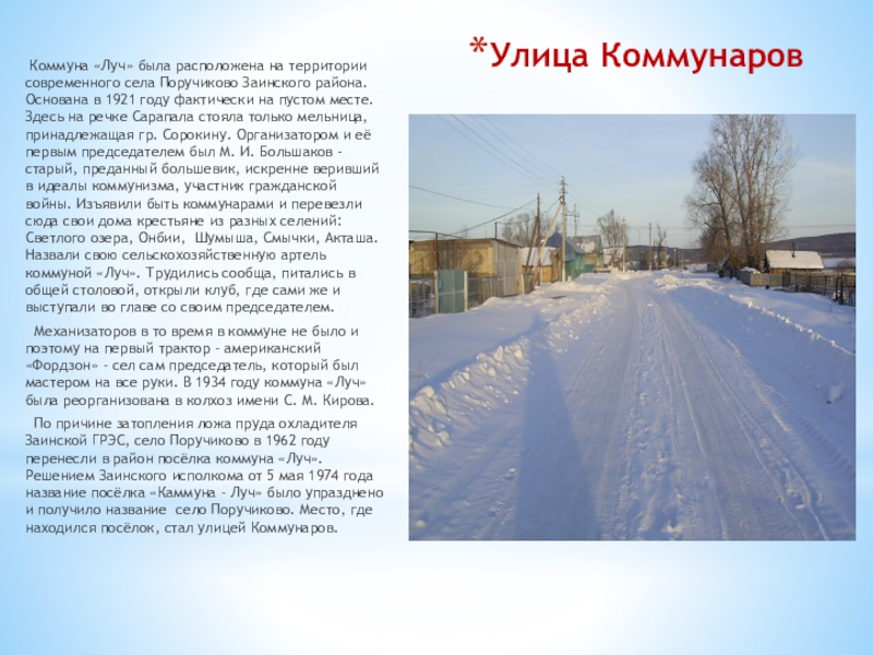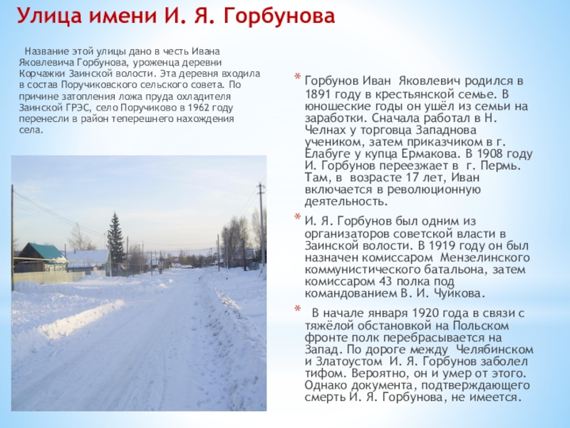 Название этой улицы дано в честь Ивана Яковлевича Горбунова, уроженца деревни Корчажки Заинской волости. Эта деревня входила в состав Поручиковского сельского совета. По причине затопления ложа пруда охладителя Заинской ГРЭС, село Поручиково в 1962 году перенесли в район теперешнего нахождения села.