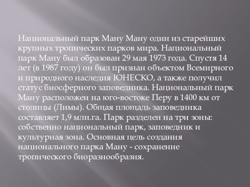 Слайд 11Национальный парк Ману Ману один из старейших крупных тропических парков мира.
