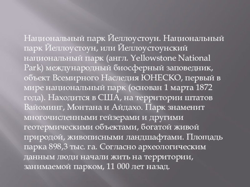 Yellowstone National Park) международный биосферный заповедник, объект Всемирного Наследия ЮНЕСКО, первый в мире национальный парк (основан 1 марта 1872 года). Находится в США, на территории штатов Вайоминг, Монтана и Айдахо. Парк знаменит многочисленными гейзерами и другими геотермическими объектами, богатой живой природой, живописными ландшафтами. Площадь парка 898,3 тыс. га. Согласно археологическим данным люди начали жить на территории, занимаемой парком, 11 000 лет назад.
