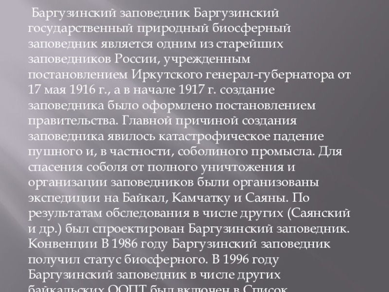 заповедников России, учрежденным постановлением Иркутского генерал-губернатора от 17 мая 1916 г., а в начале 1917 г. создание заповедника было оформлено постановлением правительства. Главной причиной создания заповедника явилось катастрофическое падение пушного и, в частности, соболиного промысла. Для спасения соболя от полного уничтожения и организации заповедников были организованы экспедиции на Байкал, Камчатку и Саяны. По результатам обследования в числе других (Саянский и др.) был спроектирован Баргузинский заповедник. Конвенции В 1986 году Баргузинский заповедник получил статус биосферного. В 1996 году Баргузинский заповедник в числе других байкальских ООПТ был включен в Список Всемирного культурного и природного наследия ЮНЕСКО (номинация "Озеро Байкал").