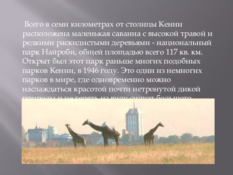 Слайд 6 Всего в семи километрах от столицы Кении расположена маленькая саванна с