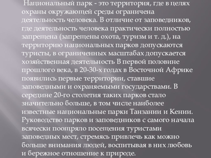 ограничена деятельность человека. В отличие от заповедников, где деятельность человека практически полностью запрещена (запрещены охота, туризм и т. д.), на территорию национальных парков допускаются туристы, в ограниченных масштабах допускается хозяйственная деятельность В первой половине прошлого века, в 20-30-х годах в Восточной Африке появились первые территории, ставшие заповедными и охраняемыми государствами. В середине 20-го столетия таких парков стало значительно больше, в том числе наиболее известные национальные парки Танзании и Кении. Руководство парков и заповедников с самого начала всячески поощряло посещения туристами заповедных мест, стремясь привлечь как можно больше внимания людей, воспитывая в них любовь и бережное отношение к природе.