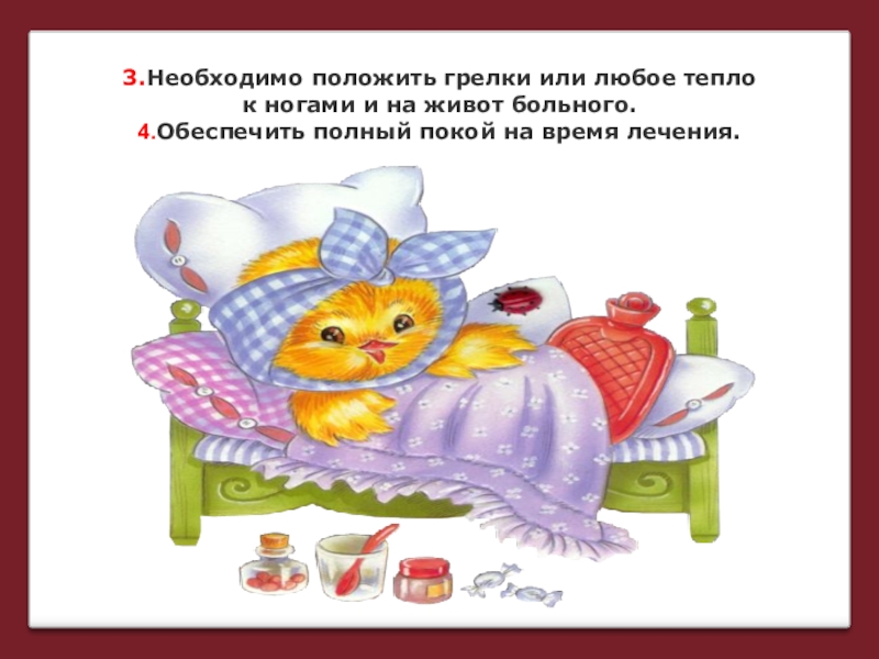 3.Необходимо положить грелки или любое тепло к ногами и на живот