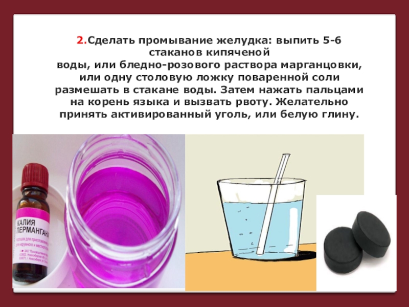 Слайд 192.Сделать промывание желудка: выпить 5-6 стаканов кипяченой