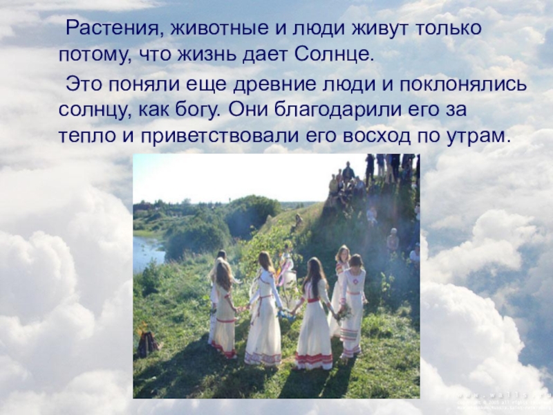 поняли еще древние люди и поклонялись солнцу, как богу. Они благодарили его за тепло и приветствовали его восход по утрам.