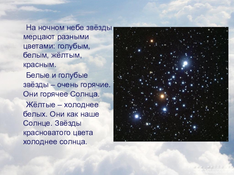 Слайд 12 На ночном небе звёзды мерцают разными цветами: голубым, белым, жёлтым, красным.