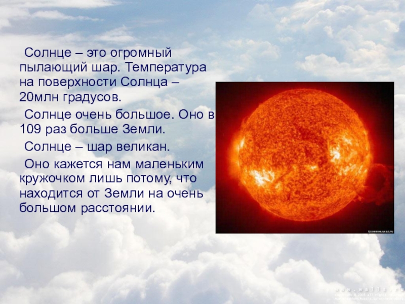 Слайд 5 Солнце – это огромный пылающий шар. Температура на поверхности Солнца –