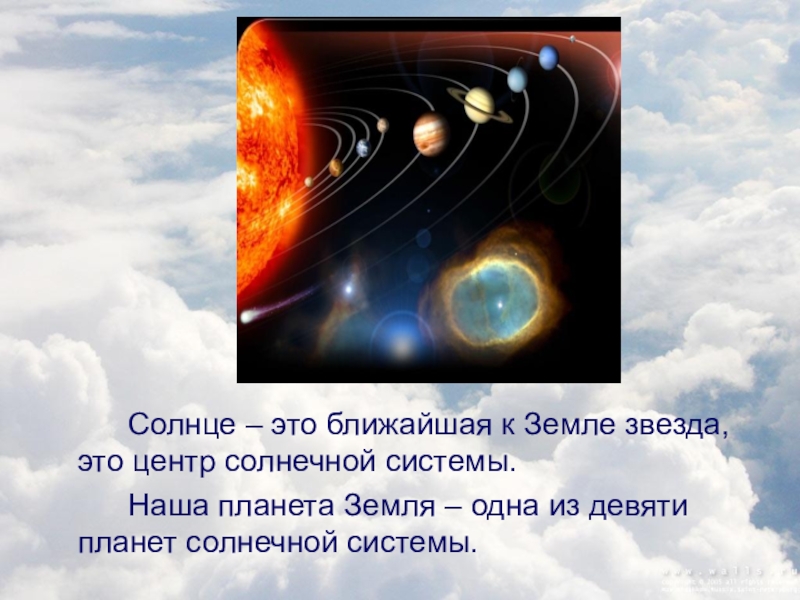 Слайд 9 Солнце – это ближайшая к Земле звезда, это центр солнечной системы.