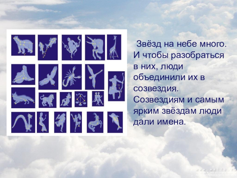 Слайд 17 Звёзд на небе много. И чтобы разобраться в них, люди объединили