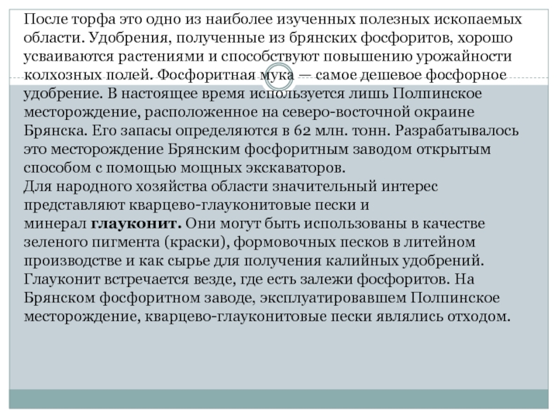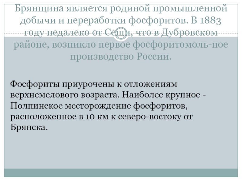 Слайд 20Брянщина является родиной промышленной добычи и переработки фосфоритов. В 1883 году