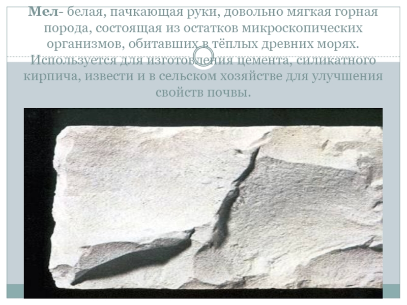 Слайд 7Мел- белая, пачкающая руки, довольно мягкая горная порода, состоящая из остатков