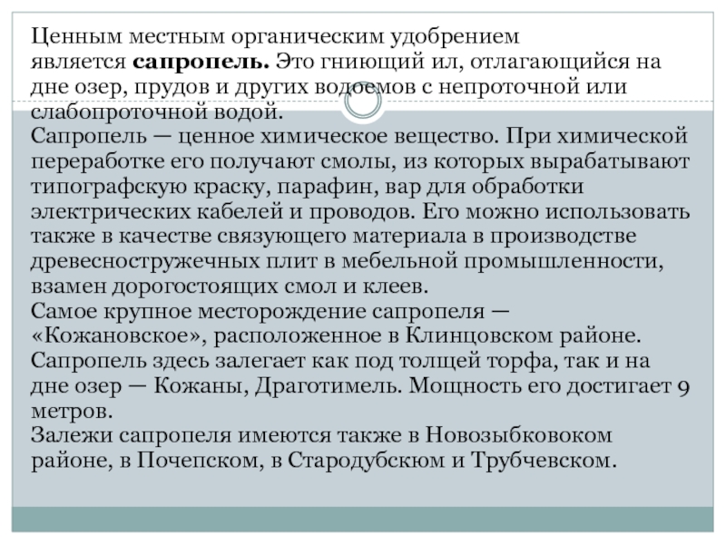 Слайд 22Ценным местным органическим удобрением является сапропель. Это гниющий ил, отлагающийся на дне озер,