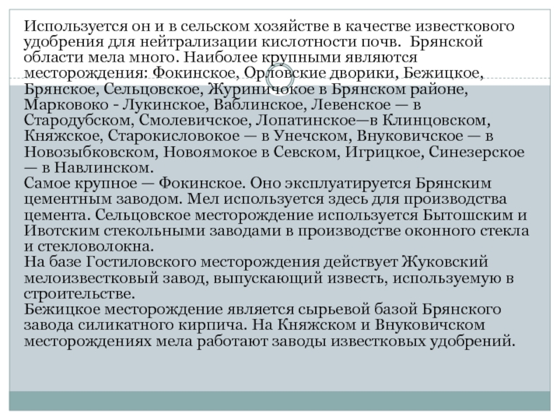 нейтрализации кислотности почв. Брянской области мела много. Наиболее крупными являются месторождения: Фокинское, Орловские дворики, Бежицкое, Брянское, Сельцовское, Журиничокое в Брянском районе, Марковоко - Лукинское, Ваблинское, Левенское — в Стародубском, Смолевичское, Лопатинское—в Клинцовском, Княжское, Старокисловокое — в Унечском, Внуковичское — в Новозыбковском, Новоямокое в Севском, Игрицкое, Синезерское — в Навлинском.