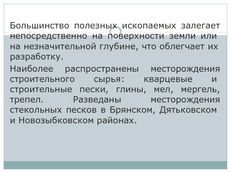 Наиболее распространены месторождения строительного сырья: кварцевые и строительные пески, глины, мел, мергель, трепел. Разведаны месторождения стекольных песков в Брянском, Дятьковском и Новозыбковском районах.