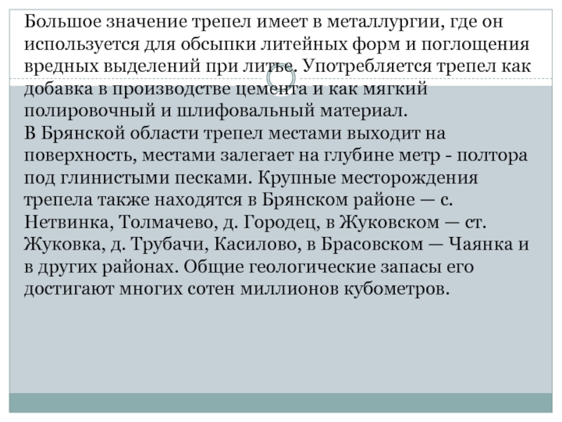 литейных форм и поглощения вредных выделений при литье. Употребляется трепел как добавка в производстве цемента и как мягкий полировочный и шлифовальный материал.