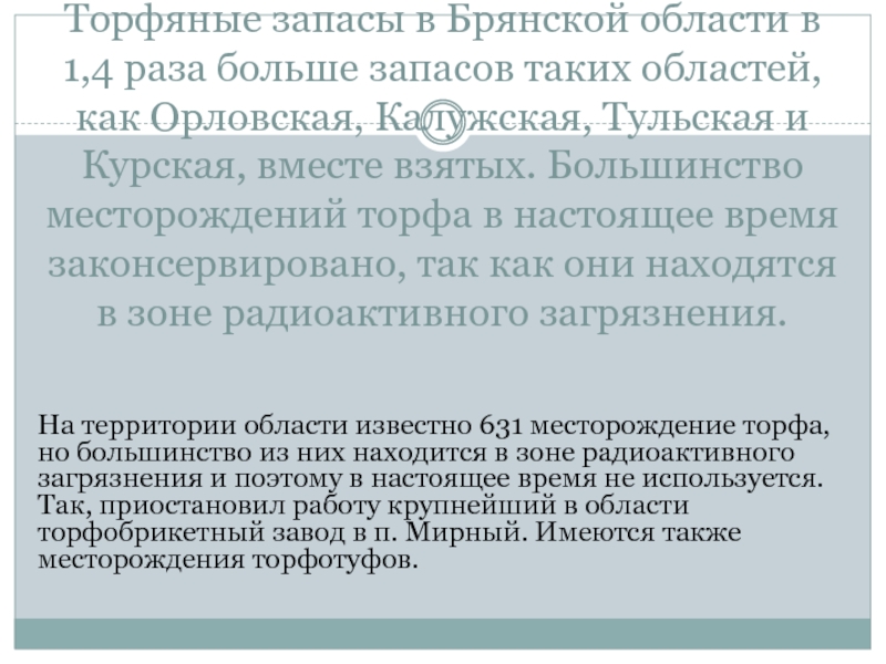 областей, как Орловская, Калужская, Тульская и Курская, вместе взятых. Большинство месторождений торфа в настоящее время законсервировано, так как они находятся в зоне радиоактивного загрязнения.