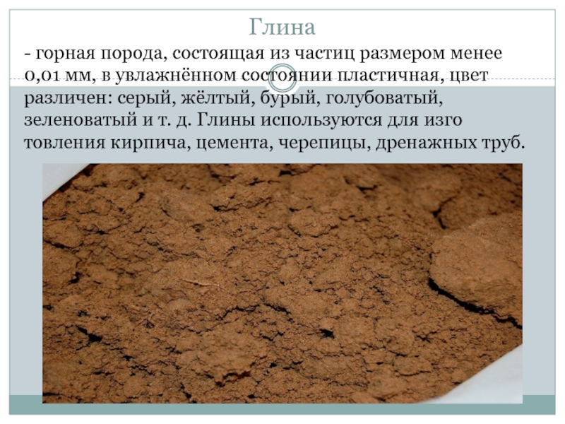 увлажнённом состоянии пластичная, цвет различен: серый, жёлтый, бурый, голубоватый, зеленоватый и т. д. Глины используются для изготовления кирпича, цемента, черепицы, дренажных труб.