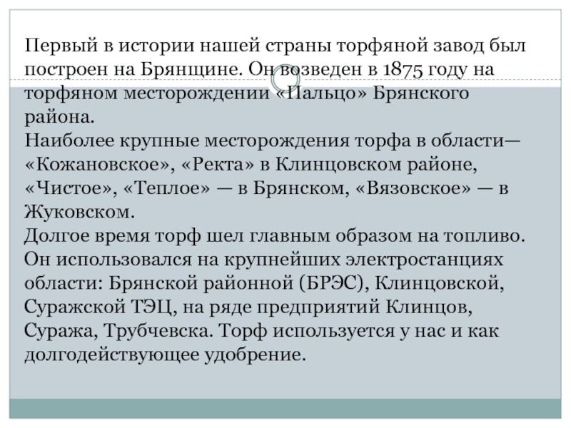 Слайд 18Первый в истории нашей страны торфяной завод был построен на Брянщине.