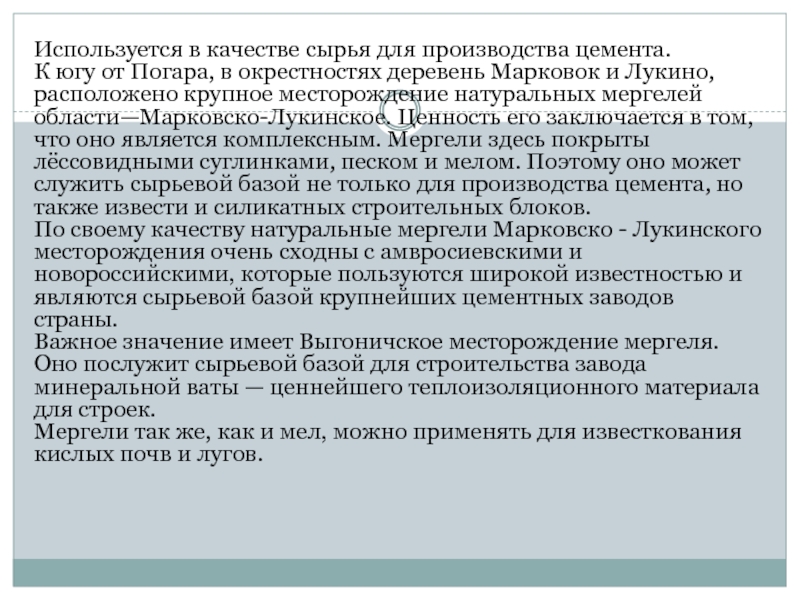 По своему качеству натуральные мергели Марковско - Лукинского месторождения очень сходны с амвросиевскими и новороссийскими, которые пользуются широкой известностью и являются сырьевой базой крупнейших цементных заводов страны.