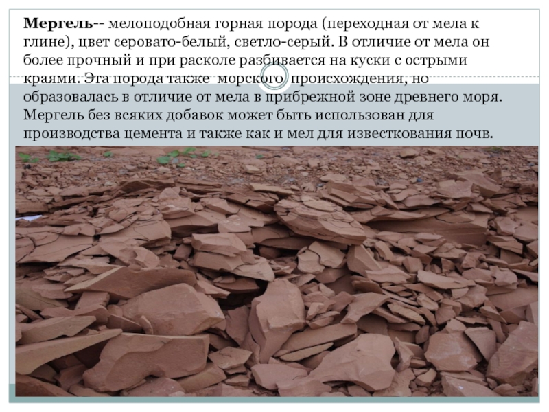 светло-серый. В отличие от мела он более прочный и при расколе разбивается на куски с острыми краями. Эта порода также морского происхождения, но образовалась в отличие от мела в прибрежной зоне древнего моря. Мергель без всяких добавок может быть использован для производства цемента и также как и мел для известкования почв.