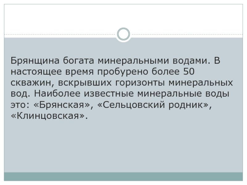 Слайд 2Брянщина богата минеральными водами. В настоящее время пробурено более 50 скважин,